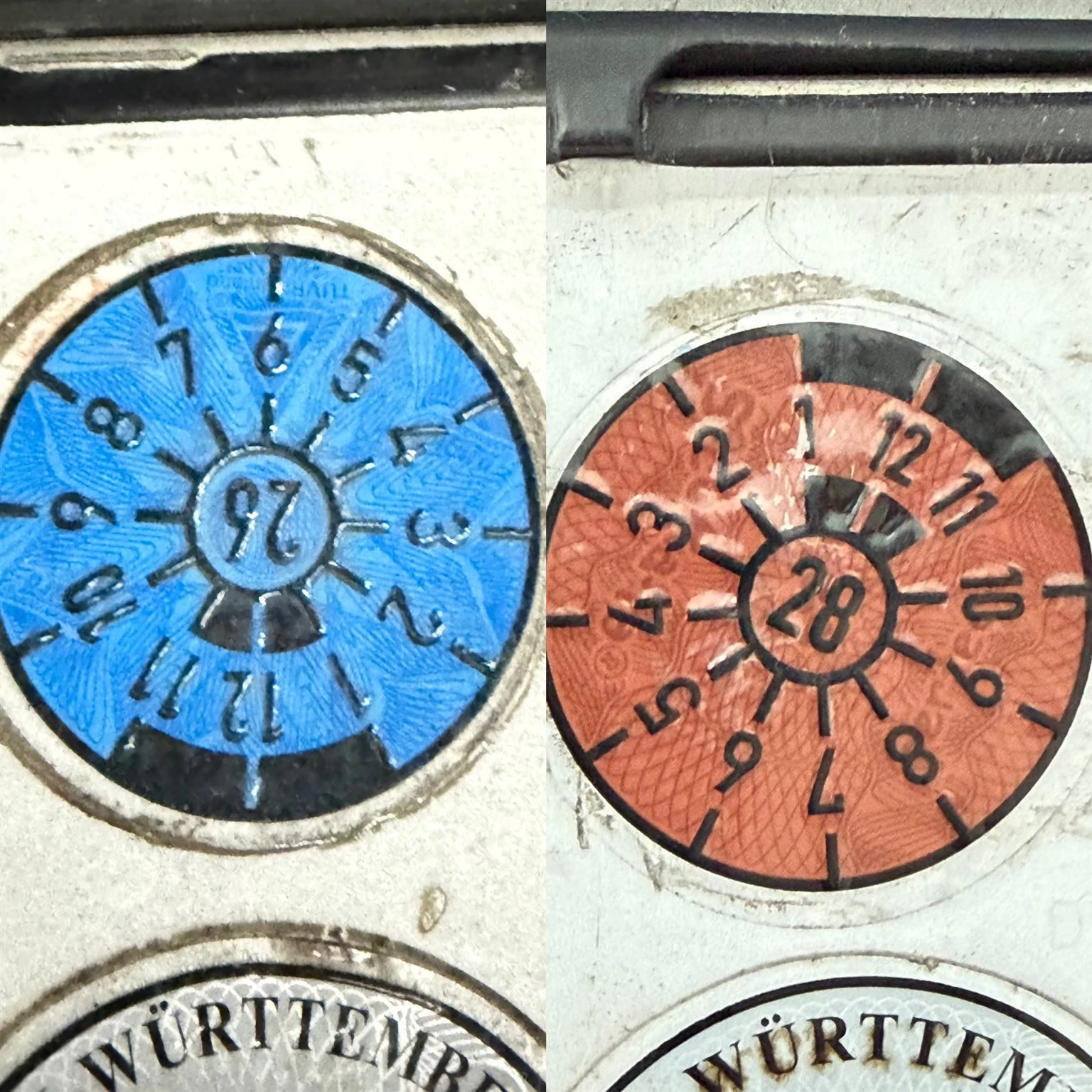 Wäre die Plakette noch Orange, wäre die TÜV Untersuchung schon letztes Jahr, 2025, fällig gewesen.